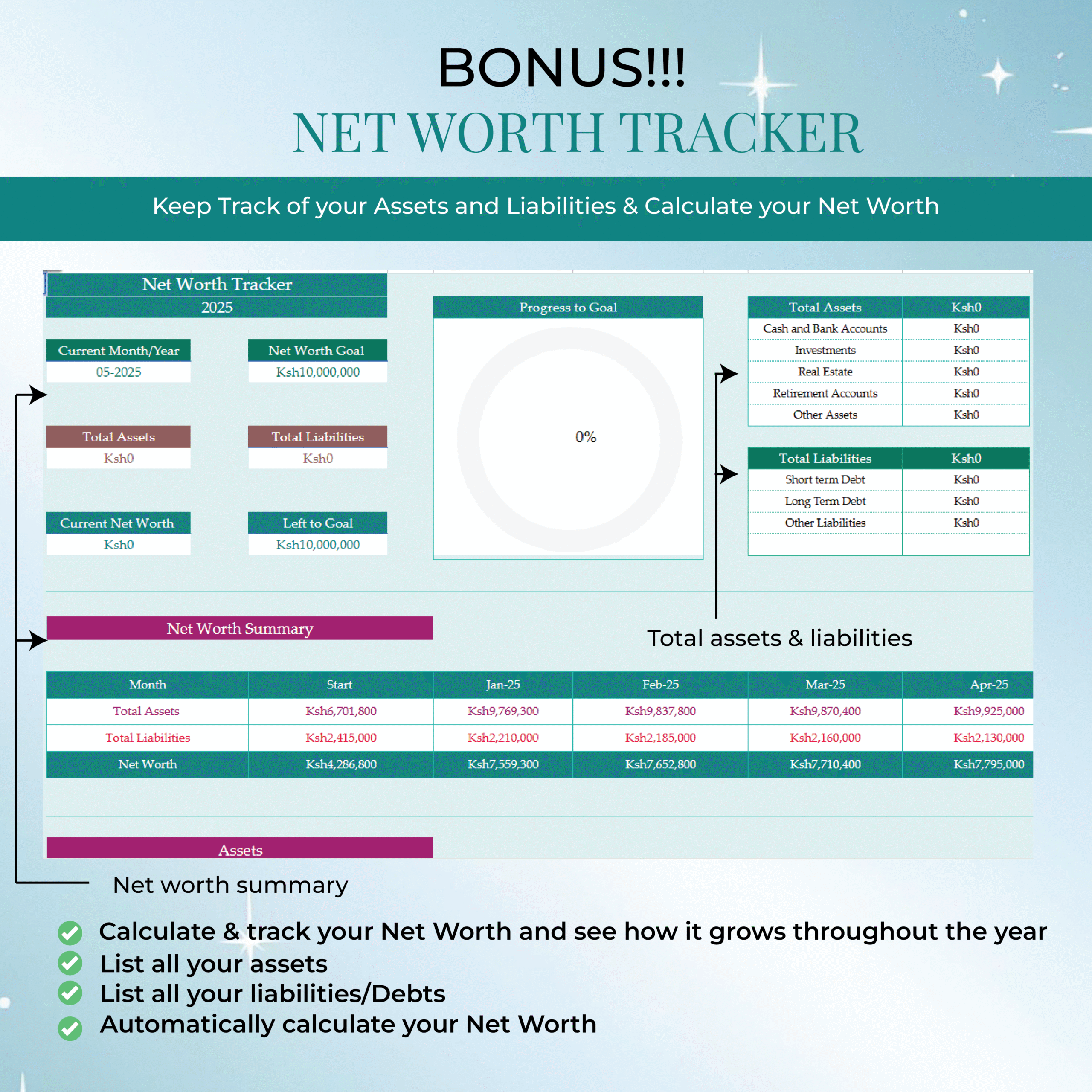 Track your assets and liabilities month by month to monitor your overall financial growth.