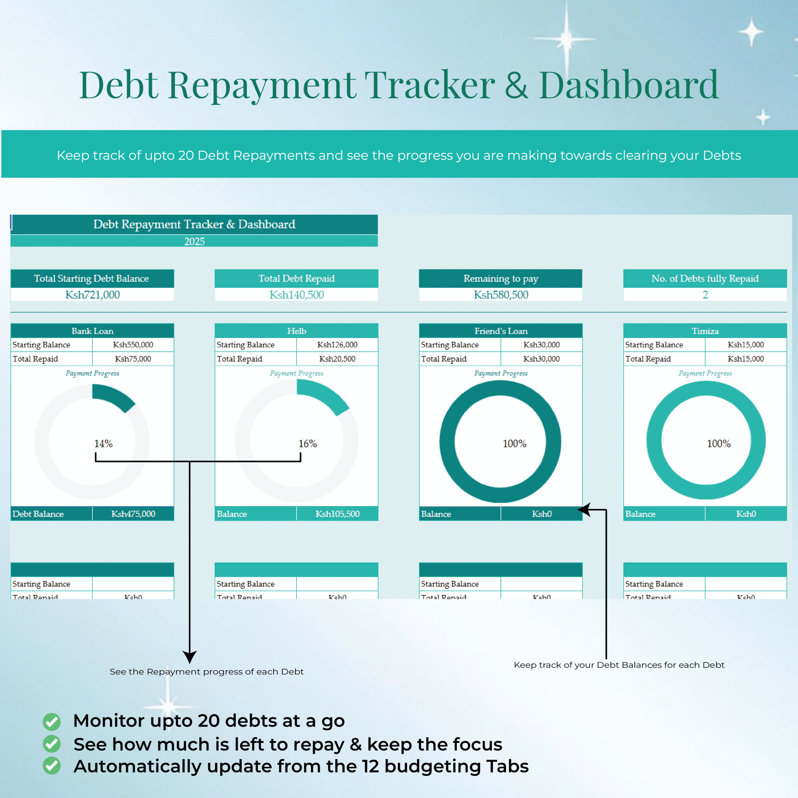 ✅ Debt Repayment Tracker – Stay motivated by visually tracking your debt reduction and managing balances month by month.