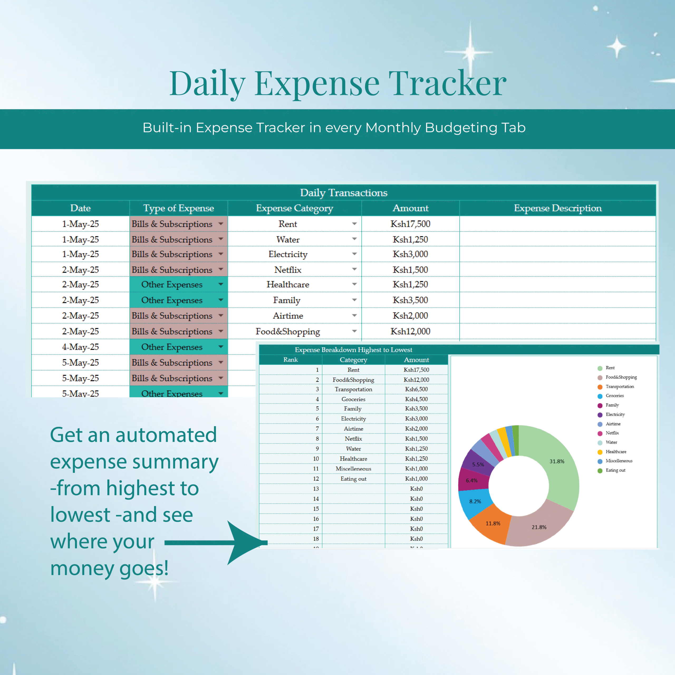 Picture this: Before the month even begins, you’ve already mapped out a clear plan for your finances. With this easy-to-use tool, you’ll plan your income, bills, expenses, savings, and debt each month. I’ve created 12 Monthly Budgeting Tabs for each month of the year. The monthly budgeting tabs are structured to accommodate recording your income, planning bills & expenses, debt repayment, and most importantly, savings. Each Monthly Budgeting Tab also has a Daily Transaction Tracker to log your expenses. As the month progresses, you can compare your budgeted expenses with your actual spending, and adjust for the next month to stay on track. Over time, you begin to notice spending patterns and streamline where necessary. As you budget each month, you get a visual summary (automated graphs) of your finances, focusing on areas like: