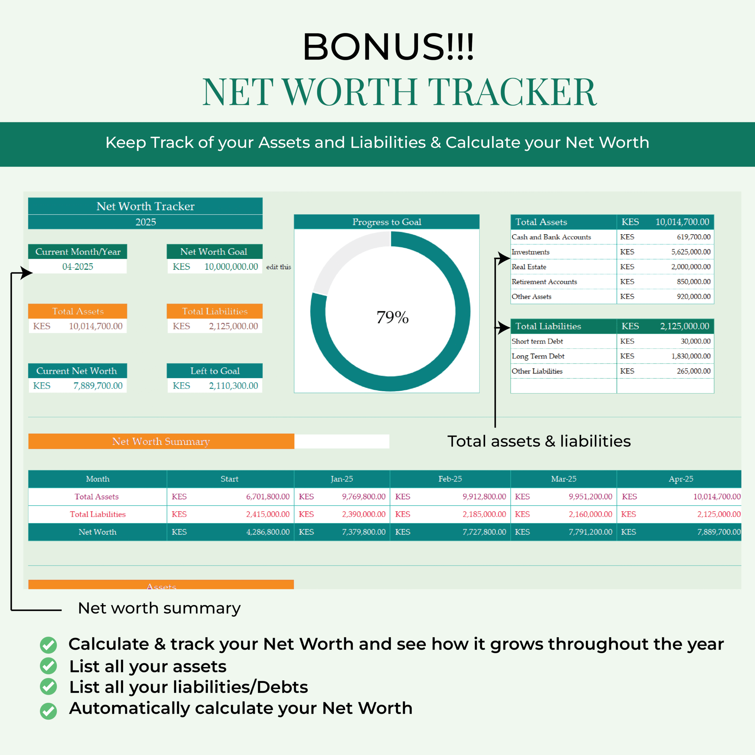 Track your assets and liabilities month by month to monitor your overall financial growth.