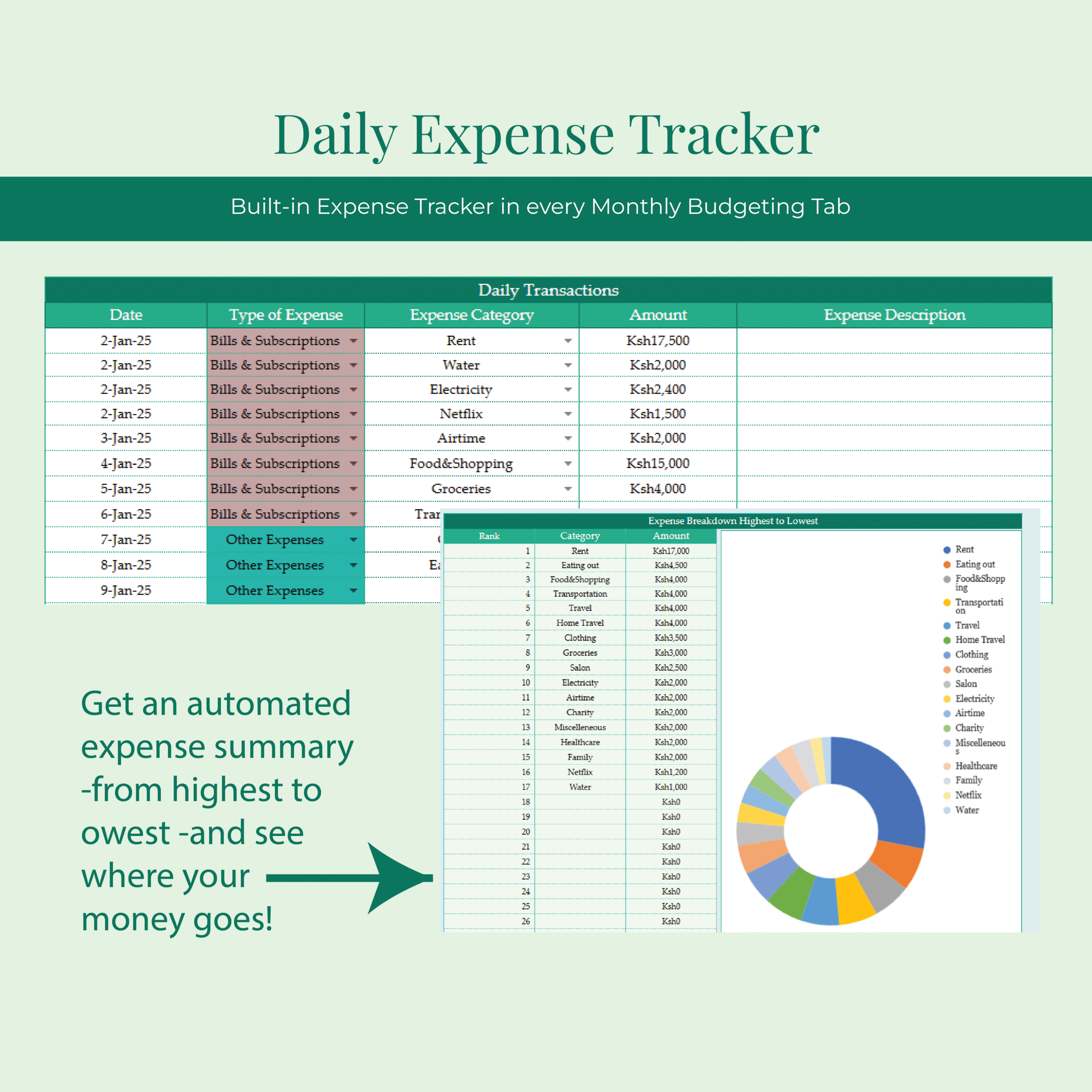 Picture this: Before the month even begins, you’ve already mapped out a clear plan for your finances. With this easy-to-use tool, you’ll plan your income, bills, expenses, savings, and debt each month. I’ve created 12 Monthly Budgeting Tabs for each month of the year. The monthly budgeting tabs are structured to accommodate recording your income, planning bills & expenses, debt repayment, and most importantly, savings. Each Monthly Budgeting Tab also has a Daily Transaction Tracker to log your expenses. As the month progresses, you can compare your budgeted expenses with your actual spending, and adjust for the next month to stay on track. Over time, you begin to notice spending patterns and streamline where necessary. As you budget each month, you get a visual summary (automated graphs) of your finances, focusing on areas like: