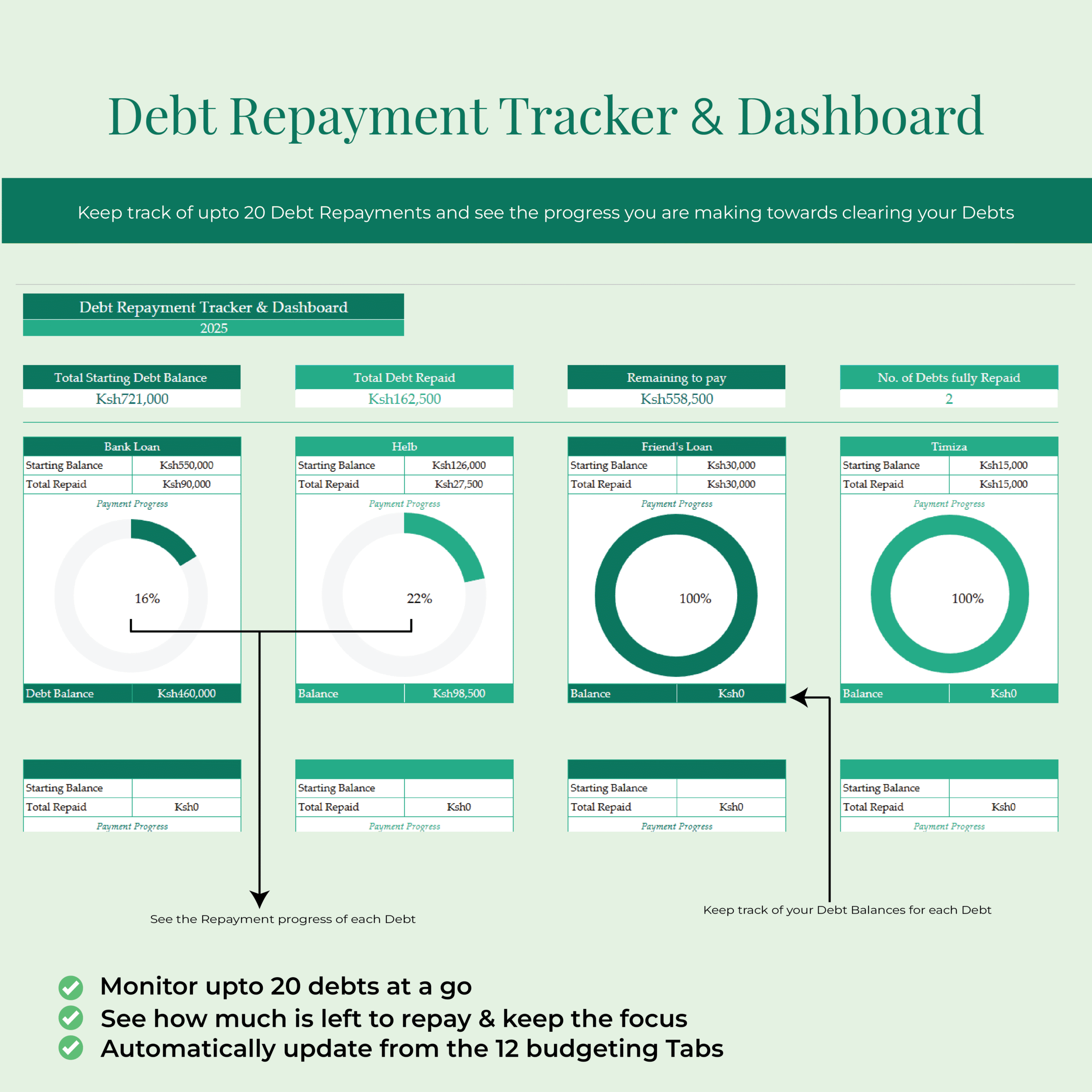 ✅ Debt Repayment Tracker – Stay motivated by visually tracking your debt reduction and managing balances month by month.