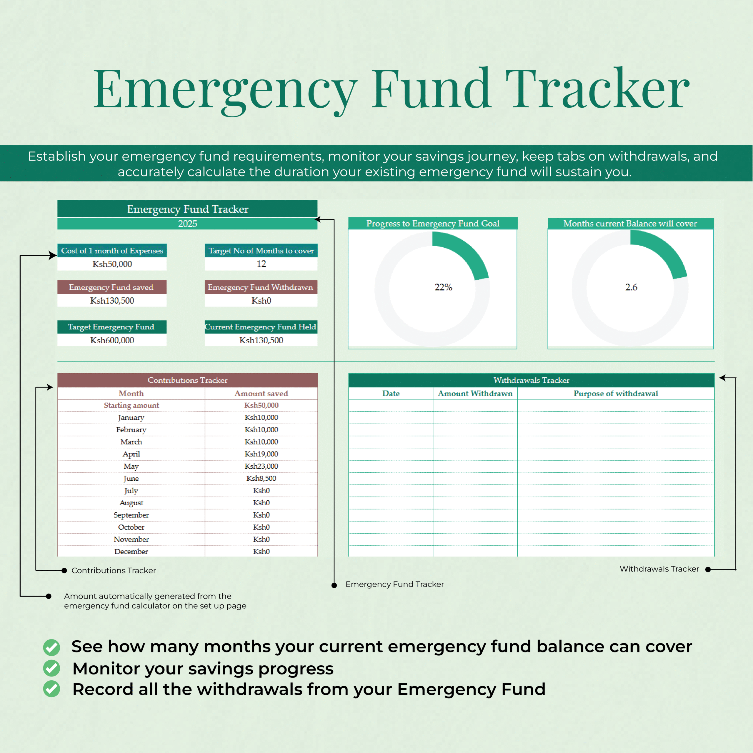 ✅ Emergency Fund Tracker – Calculate how many months you’re financially covered, and track deposits and withdrawals to ensure you’re prepared for the unexpected.